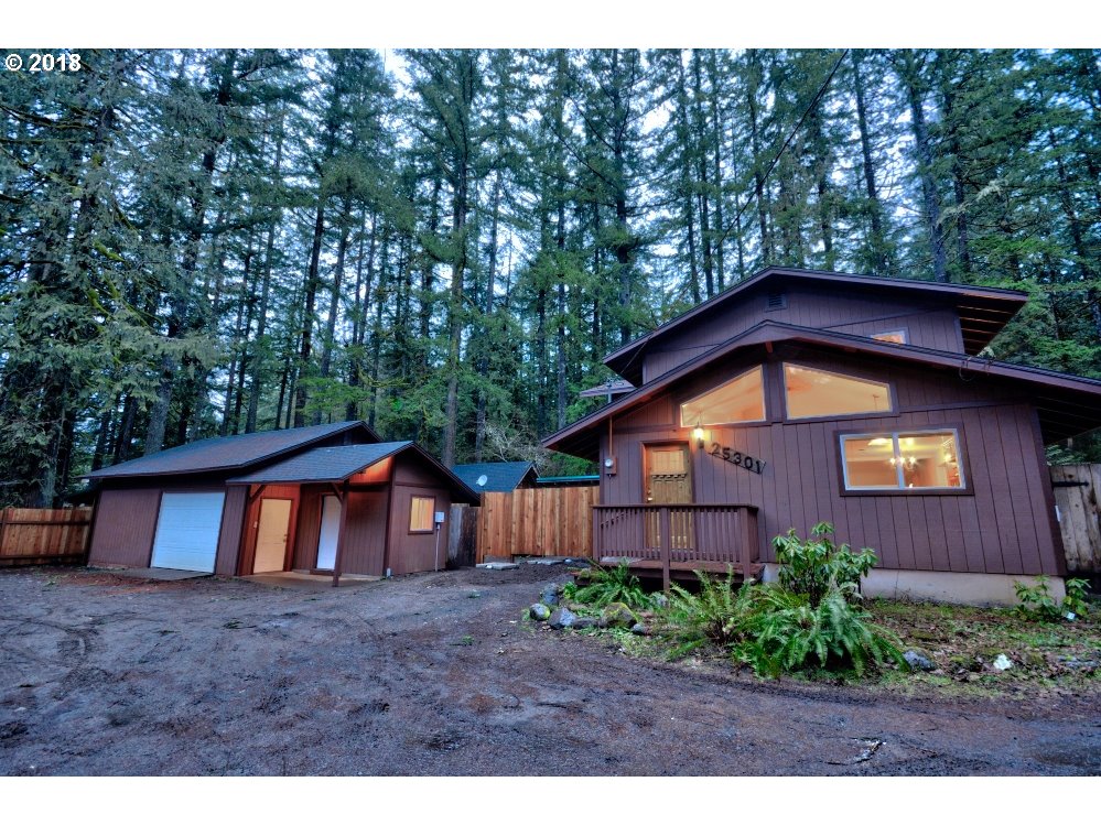 Rhododendron three bedroom two bath home with lots of extras! Well maintained, with cozy wood burning stove, new appliances, and brand new septic! Two car garage/shop, storage or office, covered hot tub and bonus log cabin. Deck plus patio and yard area. Fenced. Mud/laundry room plus upstairs loft for family room / in home office/ hobby area. Only 20 minutes from slopes, Mt. Hood National Forest across street, walk to Zig Zag River!