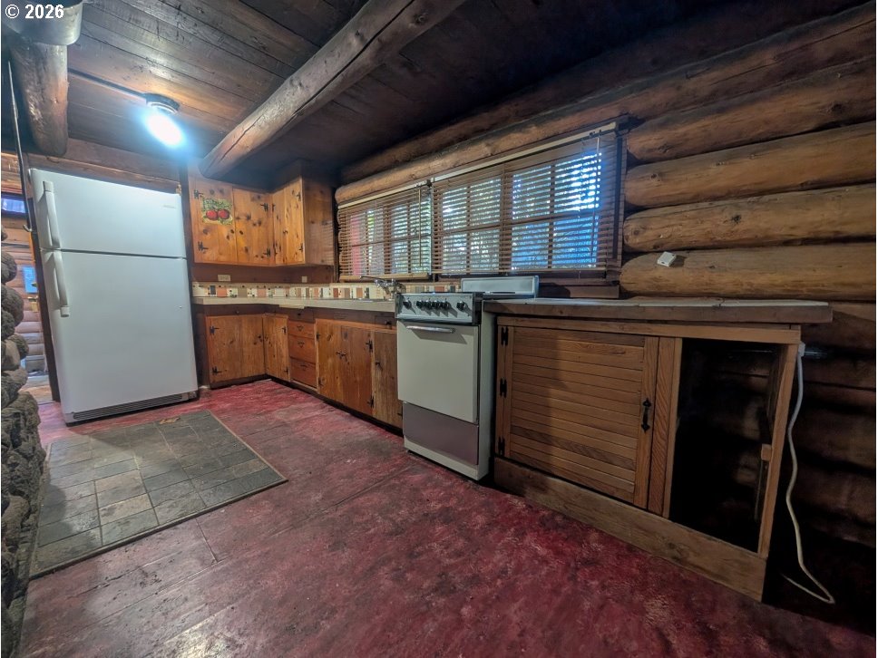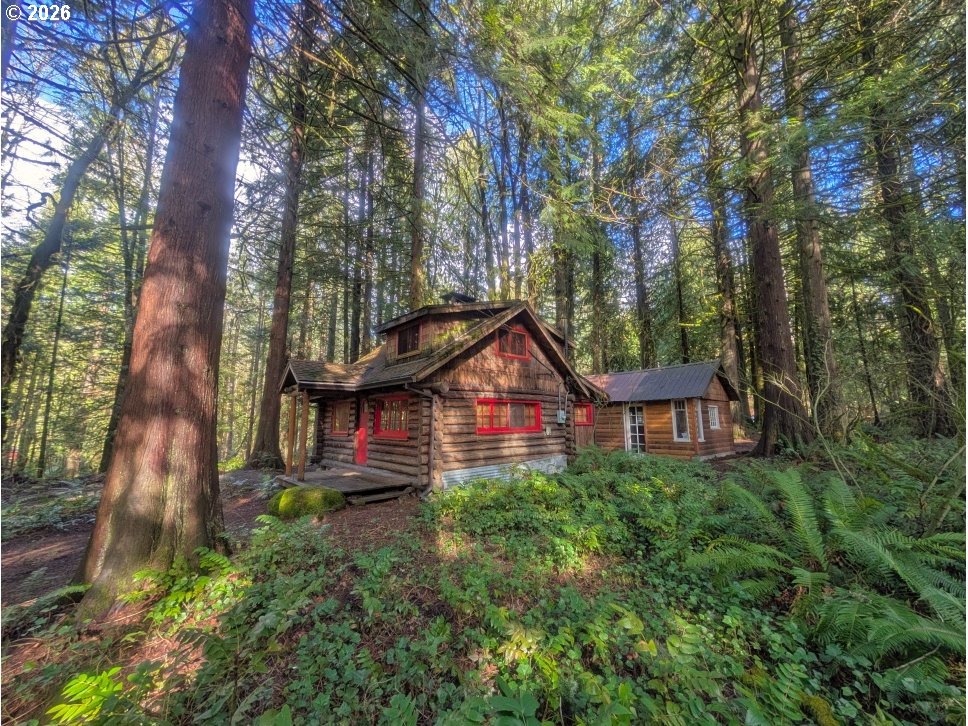 Step back in time to this 1930's log cabin in the woods on nearly a half acre of land. A prior owner told the current owner that the original builder was a Norwegian carpenter but this information was never verified. Logs and stone for the fireplace were locally sourced. The logs were also hand-hewn and the chinking was dried moss. Hand crafted features include doorknobs carved from saplings and curved small tree trunk for the stair banister. Original paned windows throughout the cabin. Covered entry on the Sampson Street side with a small deck. The location is in Welches on a wooded lot. This rustic charmer needs some TLC and updates. A bathroom was added on at some point but the date is unknown. The main structure features a living room area, kitchen and a loft upstairs for sleeping. A stone fireplace is the centerpiece of the living room with high vaulted ceilings and horizontal log beams. The fireplace is a double flue according to the owner and at one time had a wood cook stove in the kitchen. Although rustic, the kitchen does have a frig and stove along with some decorative tile along the backsplash. The original wood floors glow. A curved log tree trunk hand rail is one of the most unique features of the cabin. Upstairs is an open loft for sleeping. A bumper out dormer and skylight at the stairs brings extra storage and light. There's a tiny closet tucked in next to the stone chimney too. Recent improvements include a brand new well and an upgraded electrical panel. A spacious log sided outbuilding would make a great office or storage area. The holding tank for the new well is located in this structure. The legal address is on E. Sampson Street but a more easily accessible driveway is off E. Chambreau Road and that's what everyone uses! Walk to stores and restaurants from this location. Only one hour from Portland. Terms: cash only and sold as is.